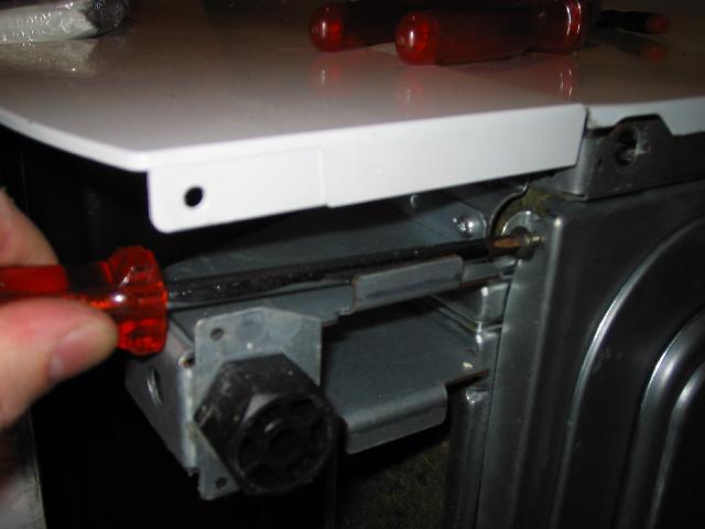 To remove the screws in the front corners, a screwdriver with a long shaft is necessary, as shown here:
