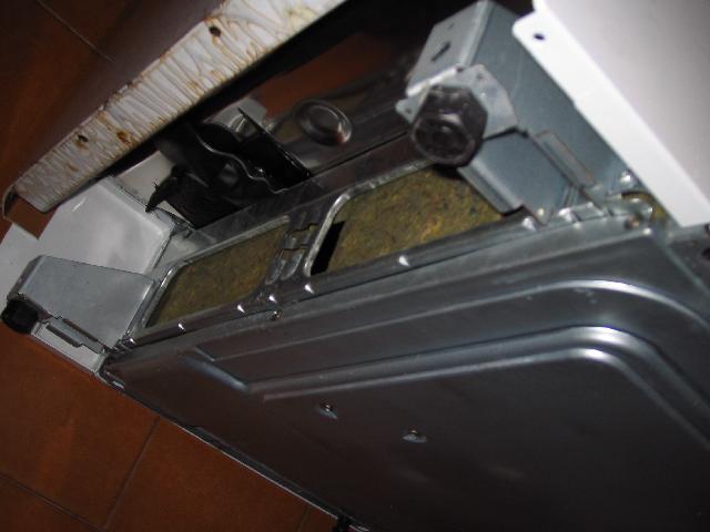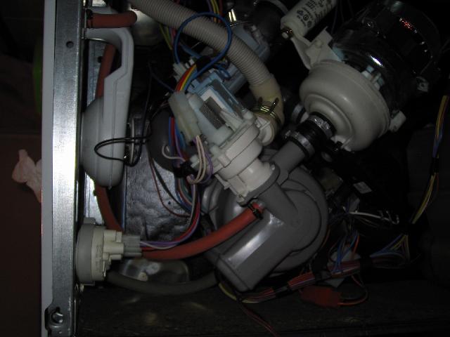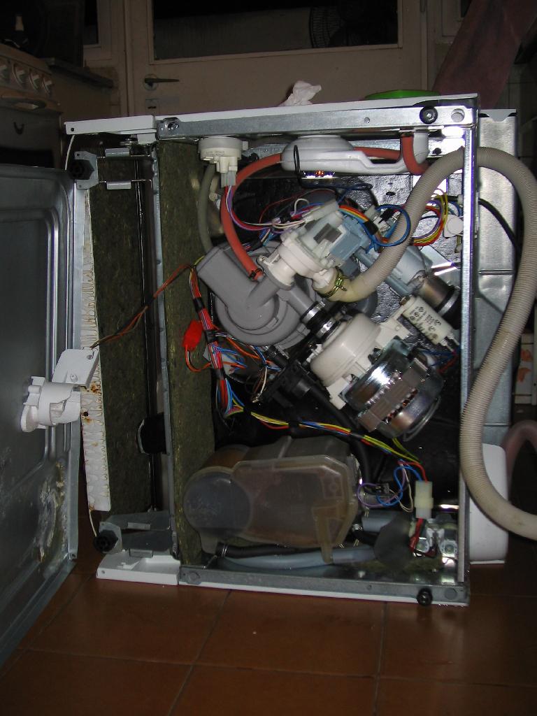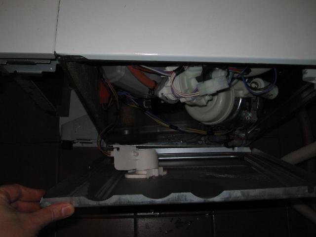 After disconnecting the cable, the bottom plate can be put away. We now have a clear view of the dishwasher's innards: