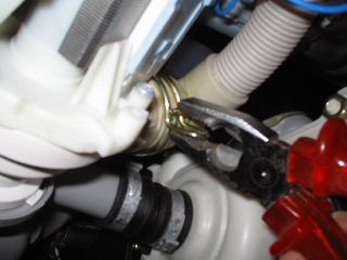 The drain hose is held in place by a quite sturdy clamp. Fortunately, not too sturdy to resist the application of pincers: